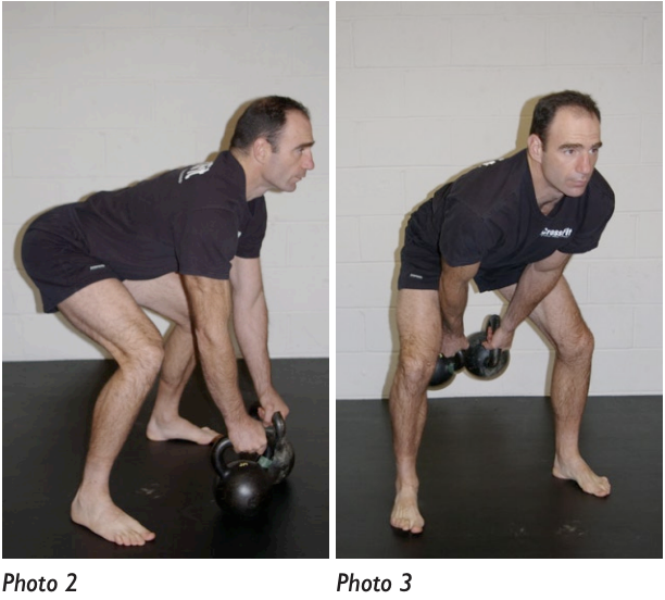 - Keeping your head up and back straight, extend your legs and pull (i.e., hike) the kettlebells up in a backward arc between your legs (photo 3).