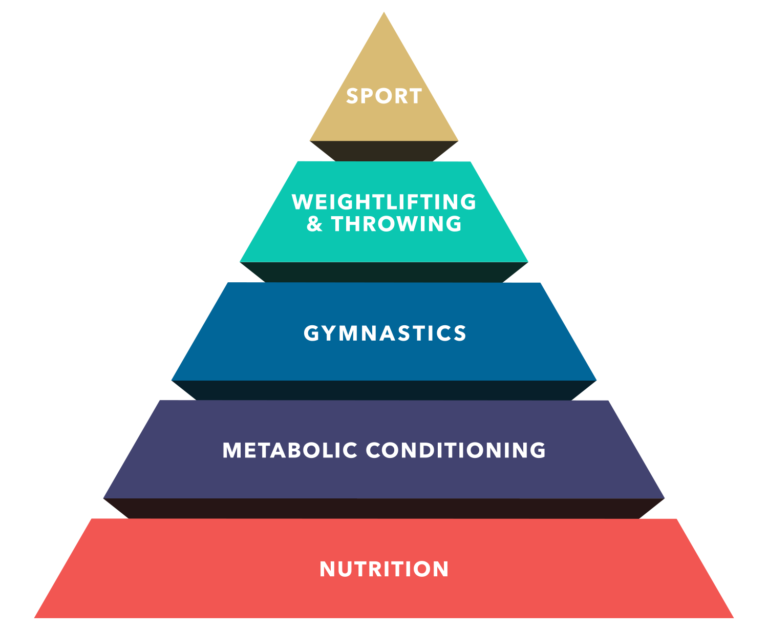 The next three levels in the Theoretical Hierarchy of Development include functional movements that represent the backbone of CrossFit workouts and programming. These are safe, natural movements that duplicate muscle contraction patterns found in sport, combat, and everyday life. They safely generate high amounts of power, taking advantage of the body’s ability to produce force and move at high velocities due to their core-to-extremity nature and ability to move large loads through complete ranges of motion.